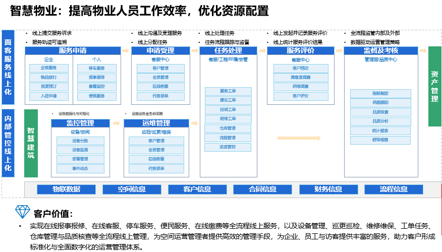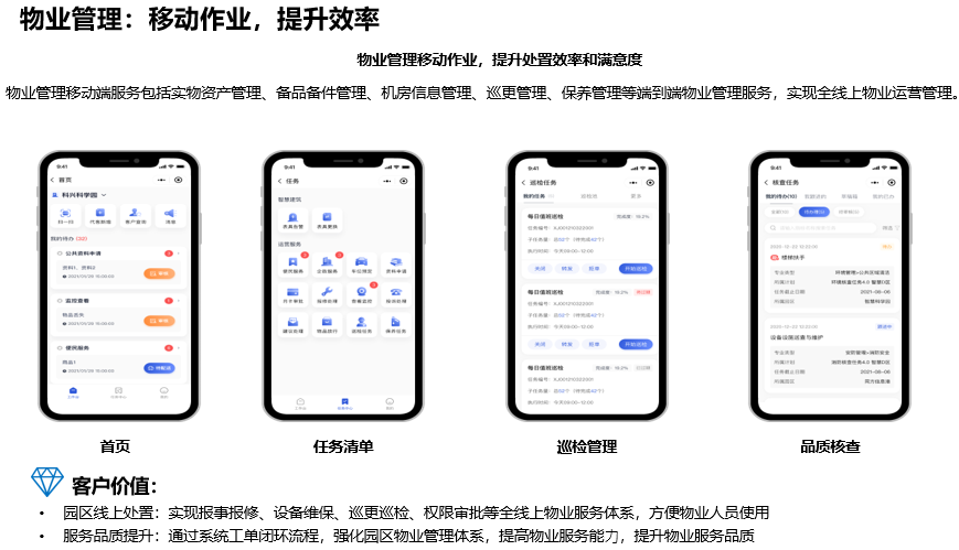 园区线上处置:实现报事报修、设备维保、巡更巡检、权限审批等全线上物业服务体系,方便物业人员使用 服务品质提升:通过系统工单闭环流程,强化园区物业管理体系,提高物业服务能⼒,提升物业服务品质