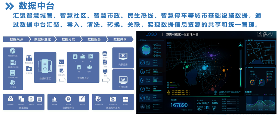 汇聚智慧城管、智慧社区、智慧市政、民生热线、智慧停车等城市基础设施数据,通过数据中台汇聚、导入、清洗、转换、关联,实现数据信息资源的共享和统一管理