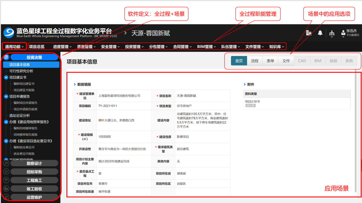 平台可根据业主方、建设单位、政府、设计方、施工方、造价方、监理方、BIM咨询、材料供应商、数字化转型企业等不同角色的业务需求,按需配置投资决策、勘察设计、招标采购、工程施工、竣工验收、运营维护等全过程的业务应用场景。