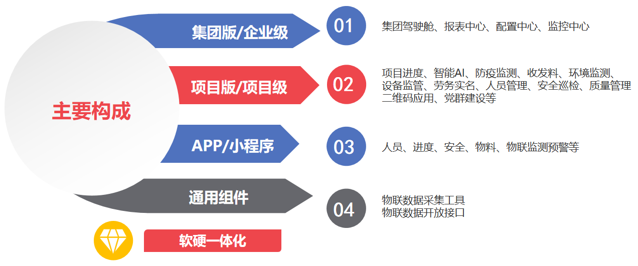 工地总览、风险分析、重大危险源监管(塔吊、升降机、钢平台、龙门吊等)、安全监测(基坑、高支模、临电、临边防护等)、绿色施工、劳务实名制、智能AI(未带安全帽识别、反光衣识别、明火识别等)、防疫监测、人员定位、电子围栏、行为监测、进度管理、质量管理、安全巡检、物料管理、资料管理、视频监控、党群建设、二维码应用等。