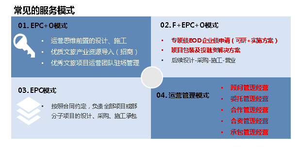 常见的服务模式常见的服务模式有四种:EPC+O模式、F+EPC+O模式、EPC模式、运营管理模式。