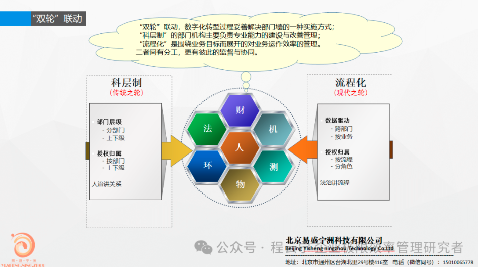 2.1、组织架构调整:科层制是企业管理常见的,也是不可以盲目改变的,可以通过加强对部门的专业化管理,以提升业务处理的能力,同时,要建立跨部门的数据驱动的流程化管理以打破部门墙,实现有时效管理的跨部门协同。