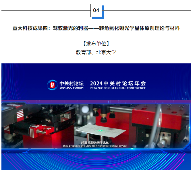 光学晶体被称为激光技术的“心脏”。北京大学科研团队创造性提出“转角相位匹配理论”,并应用氮化硼首次制备出超薄、高能效光学晶体“转角菱方氮化硼”。厚度仅为微米量级,能效提升至少100倍,为新一代激光技术奠定了理论和材料基础。