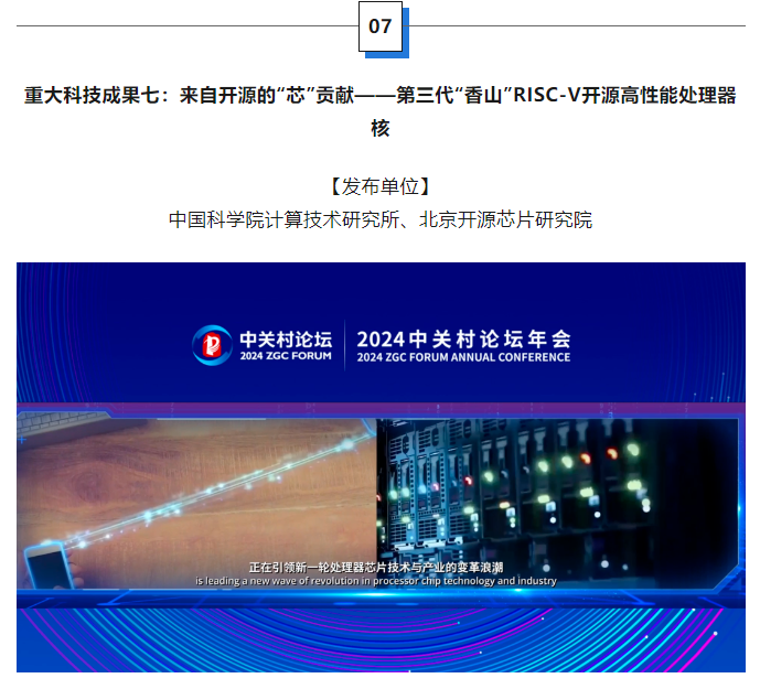 第五代精简指令集(RISC-V)正在引领新一轮处理器芯片技术与产业的变革浪潮。中国科学院计算技术研究所、北京开源芯片研究院开发出第三代“香山”开源高性能RISC-V处理器核,是在国际上首次基于开源模式、使用敏捷开发方法、联合开发的处理器核,性能水平进入全球第一梯队,成为国际开源社区性能最强、最活跃的RISC-V处理器核,为先进计算生态提供开源共享的共性底座技术支撑。