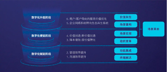 该阶段,企业通过数字化技术,实现连接、融合经营、生产、管理的各个场景,做到了初级状态的“场景革命”,在未从根本上改变现有商业模式(业务模式)的前提下,通过从流程到机制、机制到组织、组织到文化的一系列变革,做到了在现有模式下所能发挥出的最大价值。“模式价值”是该阶段的主要成果。