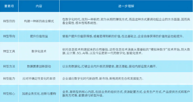 那么,这是一种什么样的“转型”呢?我们可以总结出数字化转型的六大要素,以进一步理解其内涵,如表1所示。