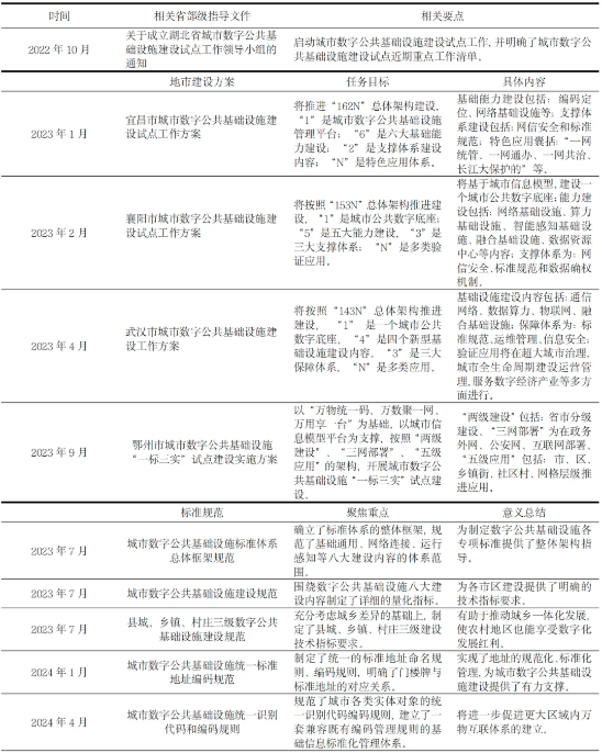 湖北省发布系列战略规划、指导意见与实施方案,在确立新型基础设施建设的领导机制、建设内容、远景目标及支撑举措的同时,更为当前城市数字公共基础设施建设的顺利推进夯实了基础条件。2022年10月湖北省成立城市数字公共基础设施建设试点工作领导小组。此后,各主要地市先后印发建设试点工作方案(如表1[1–5]所示),初步明晰了城市数字公共基础设施的建设架构、重点与具体路径。依托前期数字公共基础设施试点建设经验积累,2023年7月以来,由省住房和城乡建设厅、省公安厅提出,并联合省市场监督管理局发布了《城市数字公共基础设施标准体系总体框架规范》《城市数字公共基础设施统一识别代码编码标准》等五项地方标准(如表1所示)。这五项地方标准的发布进一步规范了湖北省推进城市数字公共基础设施建设的整体架构、建设核心与技术目标。