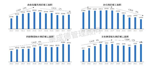 整个房建市场中地产住宅开发这块占比达到60%,所以以住宅建设维为主的企业,对行业的变化的感受更真切;公建市场,除了科研教育医疗等细分领域适度的上升,商业及服务、办公、文化体育娱乐等均是2018年达到顶峰,之后都有较平稳的下滑。