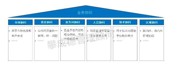 最核心的协同就是市场协同,包括企业市场信息和客户关系的共享,尤其是客户关系,虽然企业拓展了很多新业务,但是会发现新业务和自己传统业务,客户其实就是一拨人。比如说房建的公共建筑项目、市政类项目,企业要对接的都是当地政府的主管部门,客户是同一批。传统的业务领域,企业已经和客户形成了非常稳固的合作关系。另外,企业拓展新业务,如果和传统业务同步拓展,就能够给政府、业主提供更丰富更有层次的服务,更有竞争力。这一块的难点在于,新业务在拓展初期,往往没有业务积累,这里面就会面临先有鸡还是先有蛋的问题,所以非常依赖传统优势业务把新业务带出去。