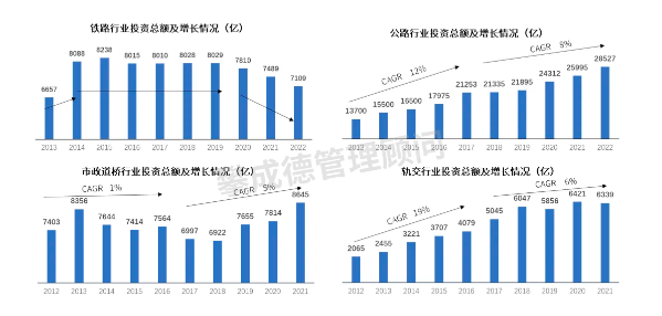 铁路2019-2020年是顶峰时期,达到8000亿规模,现在适度下滑;公路是整个基建市场体量最大,也是相对稳定的市场;市政类的两个大头,一个是市政道桥,一个是轨交,都是6000亿-8000亿的体量,有比较稳固的增长。
