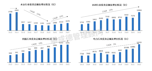 其他的一些细分行业,比如水利、电力,可以发现一个特点,就是近两年的增长速度偏慢;像民航、水运这些新兴领域虽然有一些增长,但它们整体的体量贡献度是比较低的。
