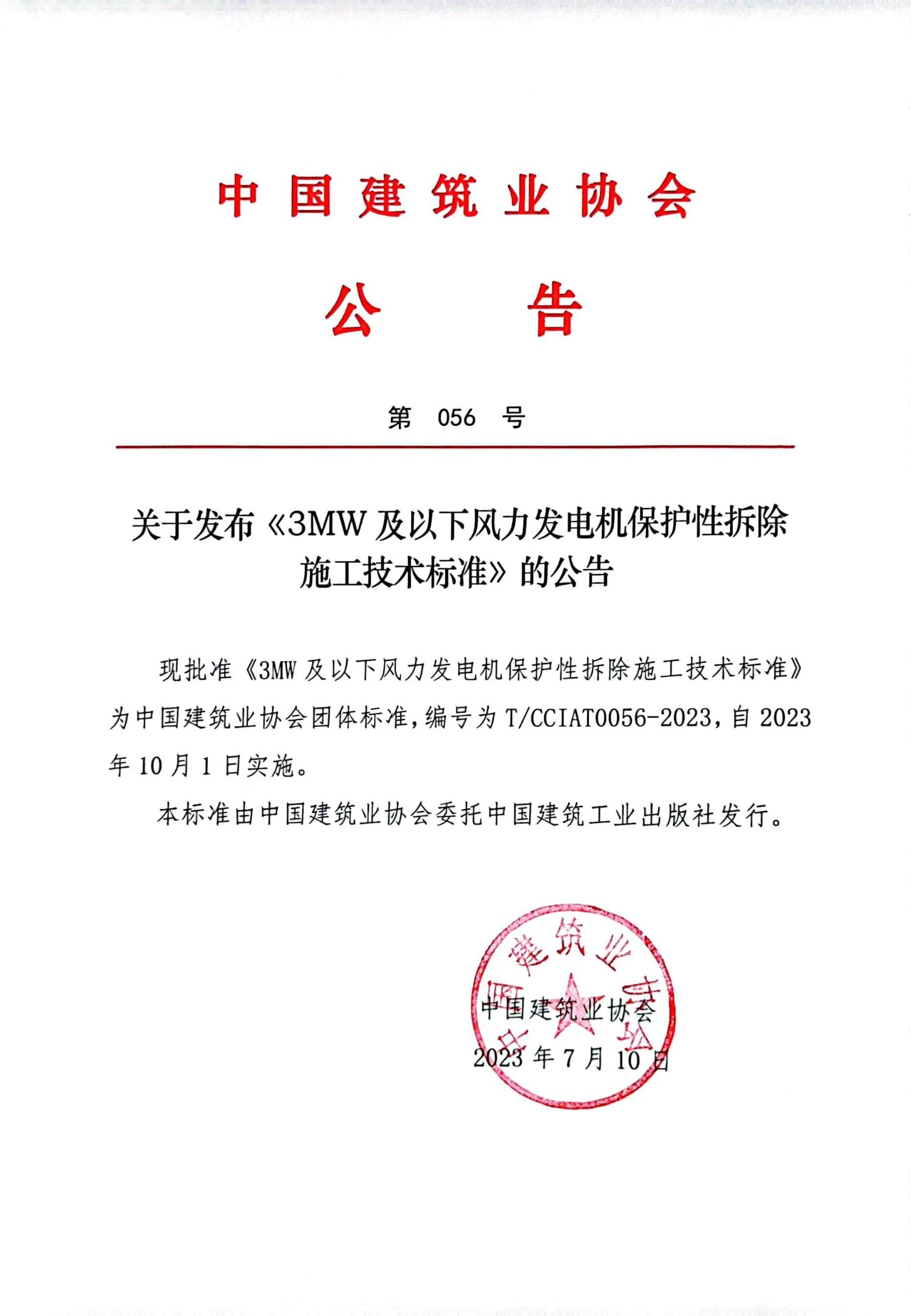 关于发布《3MW及以下风力发电机保护性拆除施工技术标准》的公告