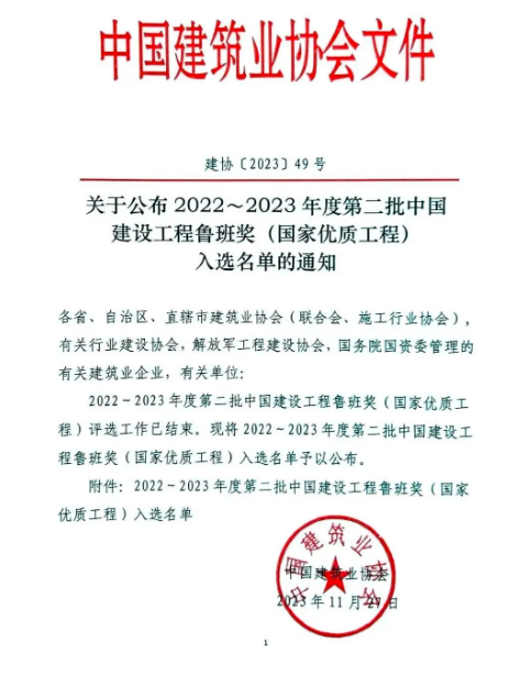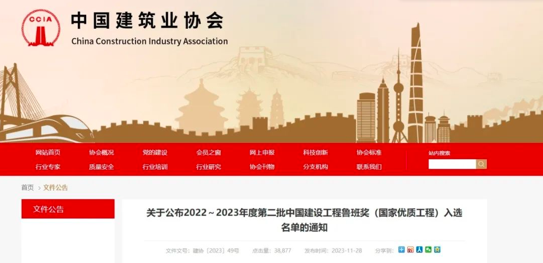 11月28日,中国建筑业协会发布了《关于公布2022~2023年度第二批中国建设工程鲁班奖(国家优质工程)入选名单的通知》,共127项工程项目入选。