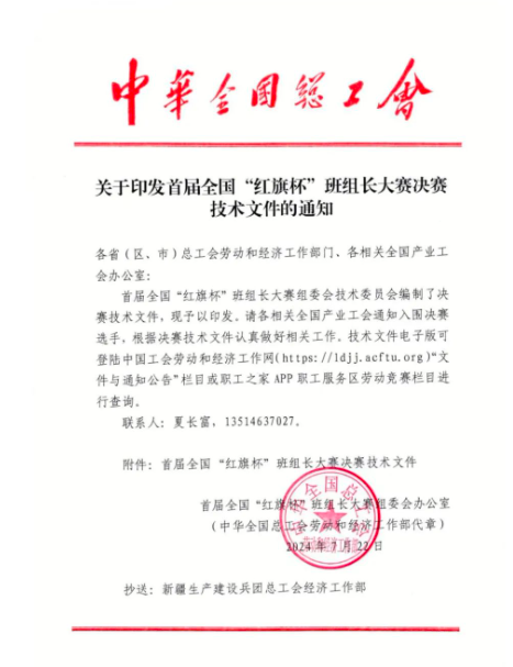 由中华全国总工会、吉林省人民政府共同举办的首届全国“红旗杯”班组长大赛决赛将于8月份开启,大赛组委会技术委员会编制了决赛技术文件。现将《中华全国总工会关于印发首届全国“红旗杯”班组长大赛决赛技术文件的通知》转发给你们,请结合个人实际深入研读,在技术层面做好充分准备,积极利用大赛平台提升自我,展现新时代工程建设领域项目经理风采。