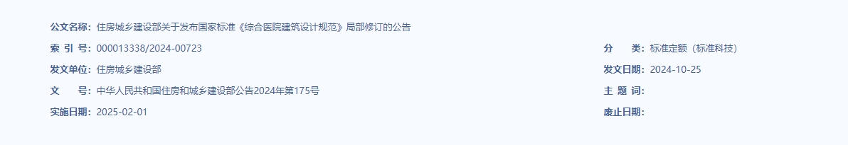 现批准国家标准《综合医院建筑设计规范》(GB51039-2014)局部修订的条文,自2025年2月1日起实施。标准名称修改为《综合医院建筑设计标准》。